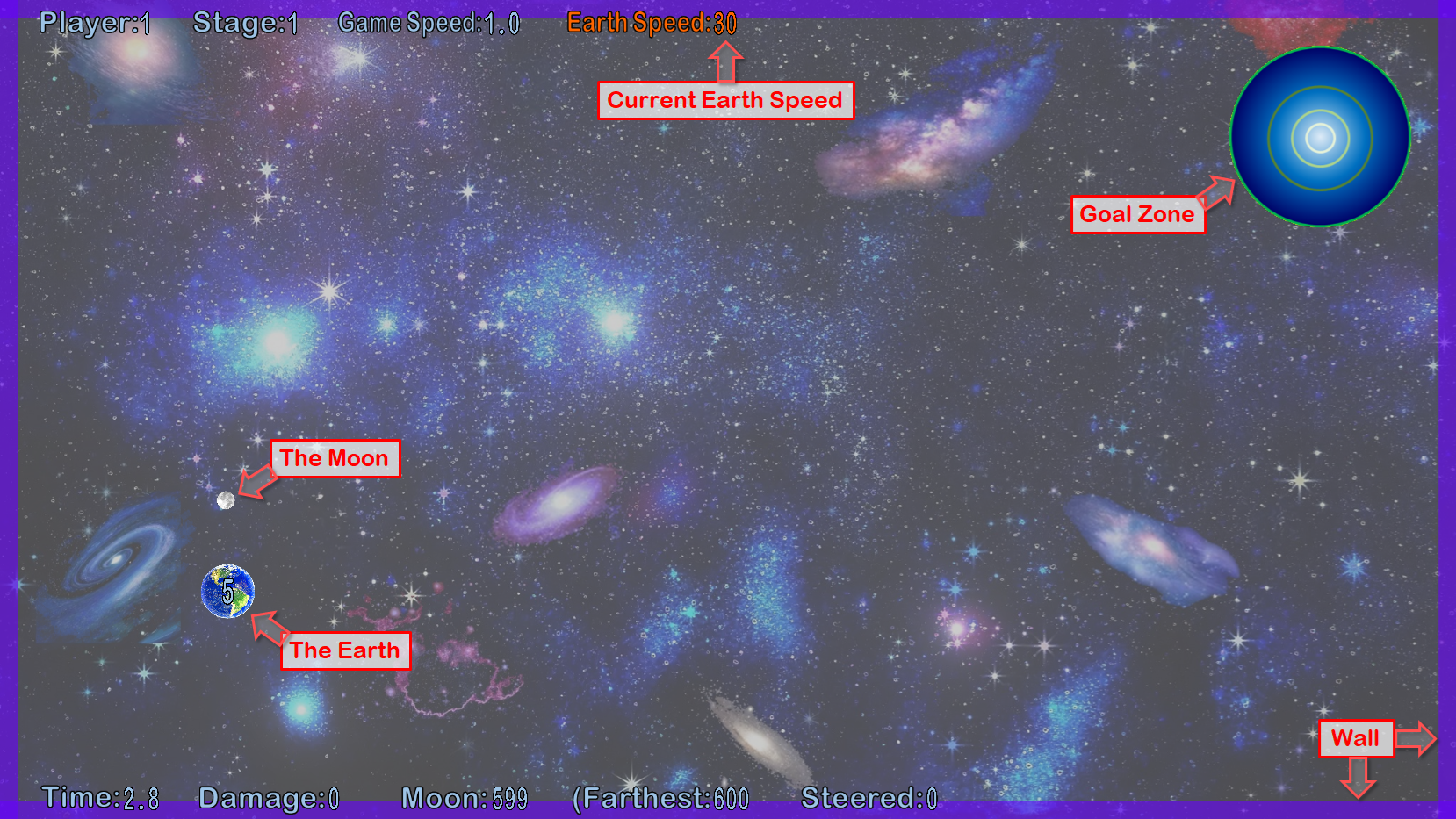 When the Earth collide with the Moon or other stars, The Earth will be damaged. When the Earth's number reaches 0 and the Earth is damaged, the Earth will break and you will fail to clear the stage.